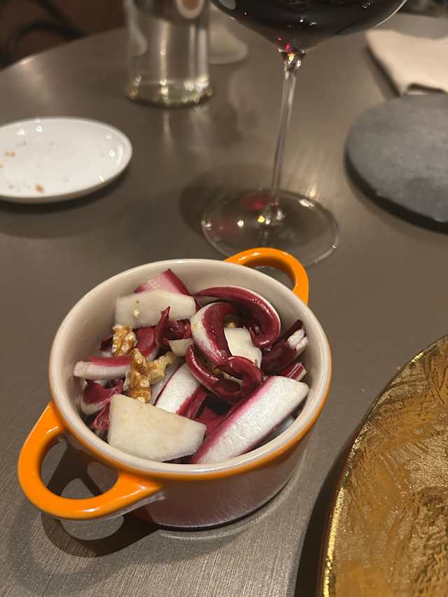 - all’aglio, olio e peperoncino su ristretto di canocchie e pollo ruspante fatto arrosto, cannocchia cruda