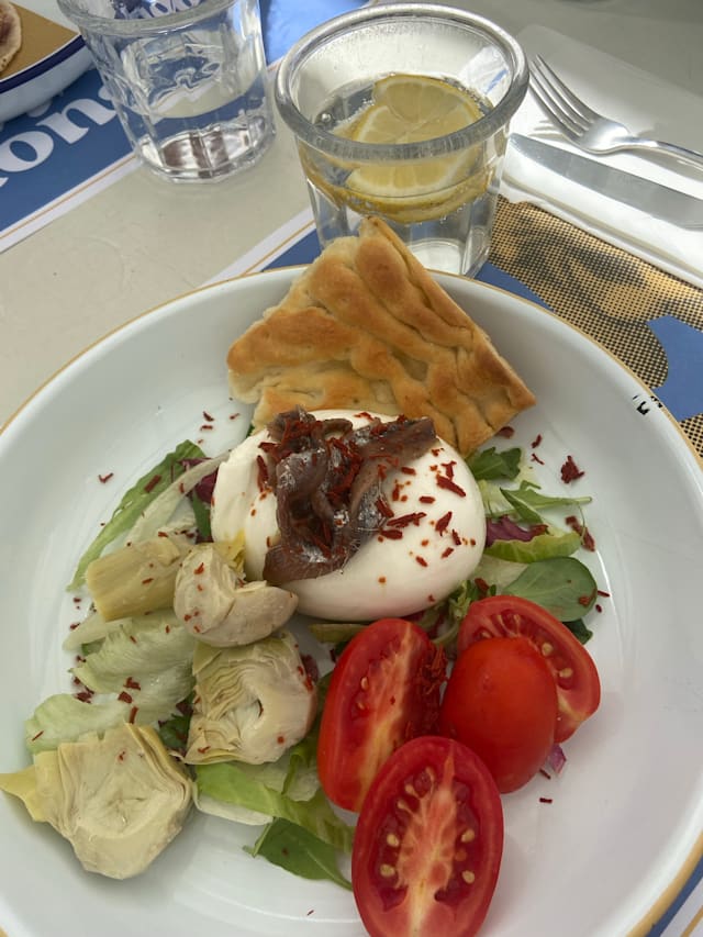 Pomodoro fresco piccadilly, burrata, carciofi al naturale, acciughe (l'anciua) e focaccia secca croccante