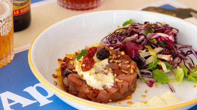 Tartare di tonno fresco (130 g.) condita con battuto di capperi, acciuga, pomodoro secco e cipolla croccante, accompagnata da fresca misticanza