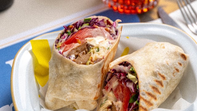 Piadina farcita con deliziosi straccetti di seitan biologico (az. agricola monastero), insalata croccante, cipolla rossa, pomodoro fresco e salsa guacamole. Tabasco facoltativo
