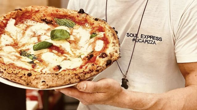 - 1°gusto: salsiccia friarielli provola, 2°gusto: vellutata di pistacchio artigianale, pancetta, crocchè artigianale, 3°gusto: pomodoro, fiordilatte, salame piccante,melanzane a funghetto
