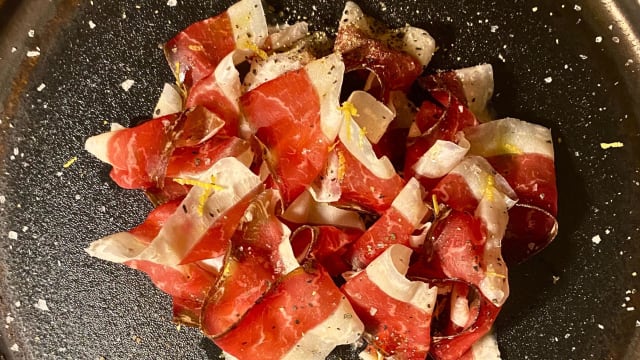 Carpaccio di picanha sashi finlandia maturato 30 giorni. Servito con olio evo monocultivar, sale di maldon, pepe, zest di limone