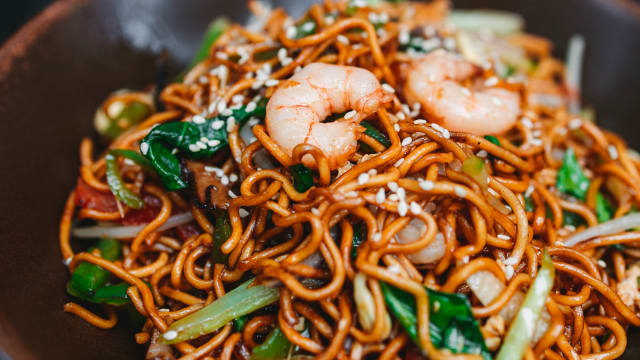 Noodles salteado con costilla de cerdo cortada en cuadrados acompañado de salsa del chef.