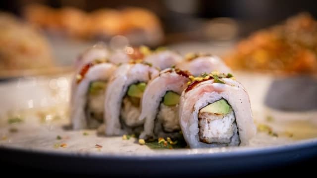 Spicy tuna, avocado, ventresca di tonno, philadelphia, kizami wasabi, caviale di storione e polvere d'oro