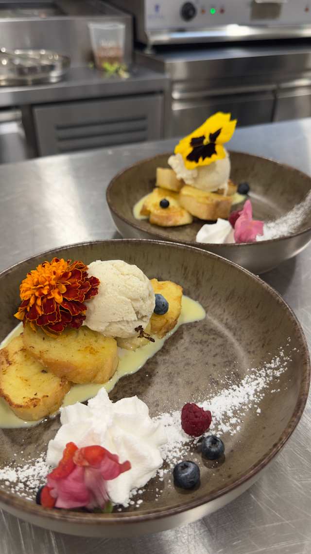 - Pain perdu, crème anglaise et coulis au choix: nutella, fruits rouges ou miel