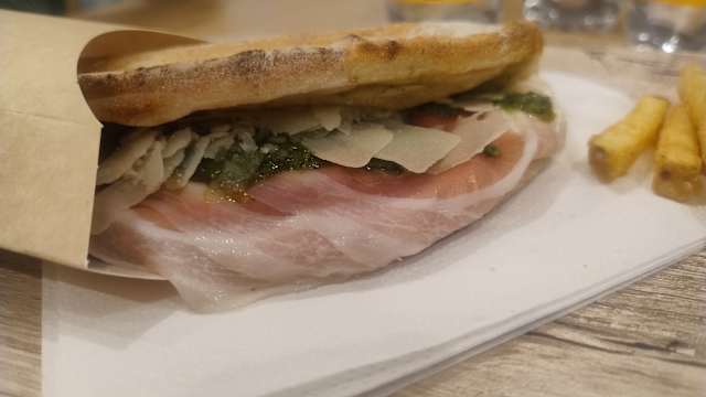 - Pancetta nostrana DOP 100% italiana, stracciatella pugliese, pesto fresco alla genovese senz'aglio, petali di grana padano dop.
