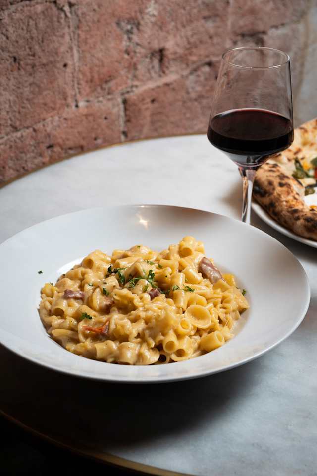- Rigatoni, espaguetis o linguini con guanciale, crema de huevo, pecorino y pimienta.