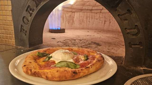 - Salsa de tomate, ajo, orégano, burrata y albahaca.