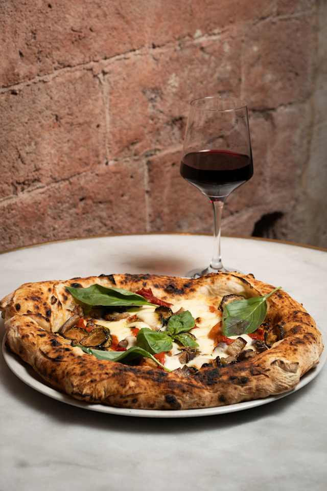 - Salsa de tomate, mozzarella, berenjena frita, virutas de parmesano y albahaca.