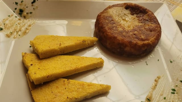 Spezzatino di manzo, in sugo a base di pomodoro paprica e cipolle. Accompagnato con polenta di mais giallo