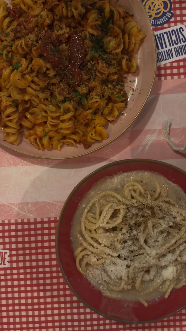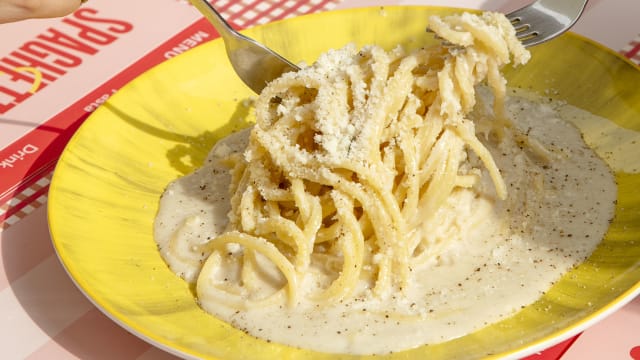 Pasta, guanciale, uova pastorizzate, pepe nero, pecorino romano DOP