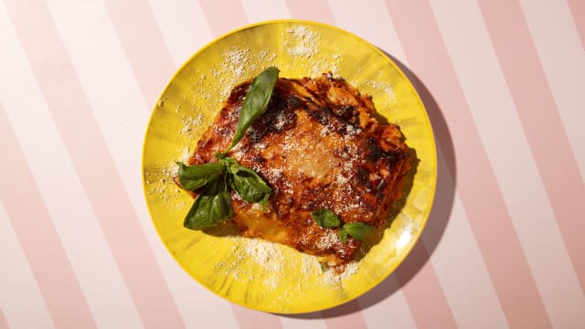 Farina di semola, acqua, tuorlo, ragù alla bolognese (olio extra vergine di oliva, carne di maiale e vitello, cipolle, carote, sedano, salsa di pomodoro, concentrato di pomodoro, sale, pepe nero), mozzarella fior di latte, besciamella fatta in casa, parmigiano reggiano, pepe nero, sale, olio