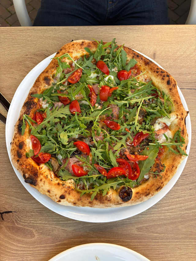 - Fior di latte, rucola, bresaola burrata (runder carpaccio), cherry tomaatjes, parmezaanse kaas
