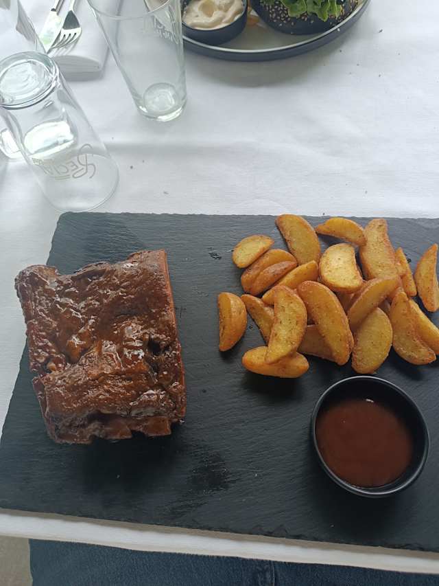 - Costine di maiale affumicate per 6 ore in slow cooking, glassate in salsa barbecue, servite con rustiche speziate al rosmarino.