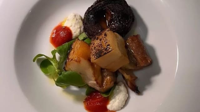 Il suo fondo alla cacciatora, relish di pomodorini e friggitelli, maionese d'aglio nero.