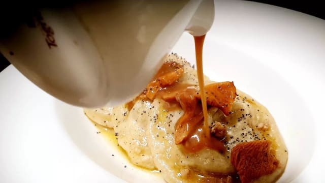 Laccatura ai fiori di sambuco, salsa remoulade, cipolla fondente, ristretto di petali di ibisco - sake.