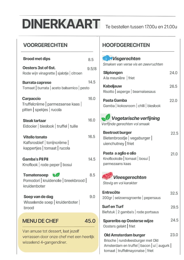 Van amuse tot dessert, laat jezelf verrassen door onze chef met een heerliik wisselend 4-gangendiner.