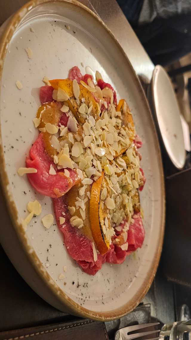 - Carpaccio di manzo con salsa alle nocciole e mango affumicato