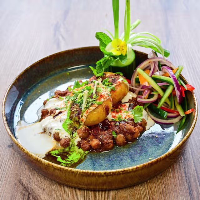 - Een chef’s special combinatie van aardappel, kikker-erwten, krokante papdi, yoghurt en chutneys.