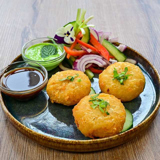 - Mix van groenten in een beslag van kikkererwten-meel, gekruid en krokant gefrituurd. Geserveerd met dips.