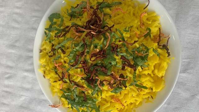 - Tiras de cebolla frescas fritas en mantequilla y especias
