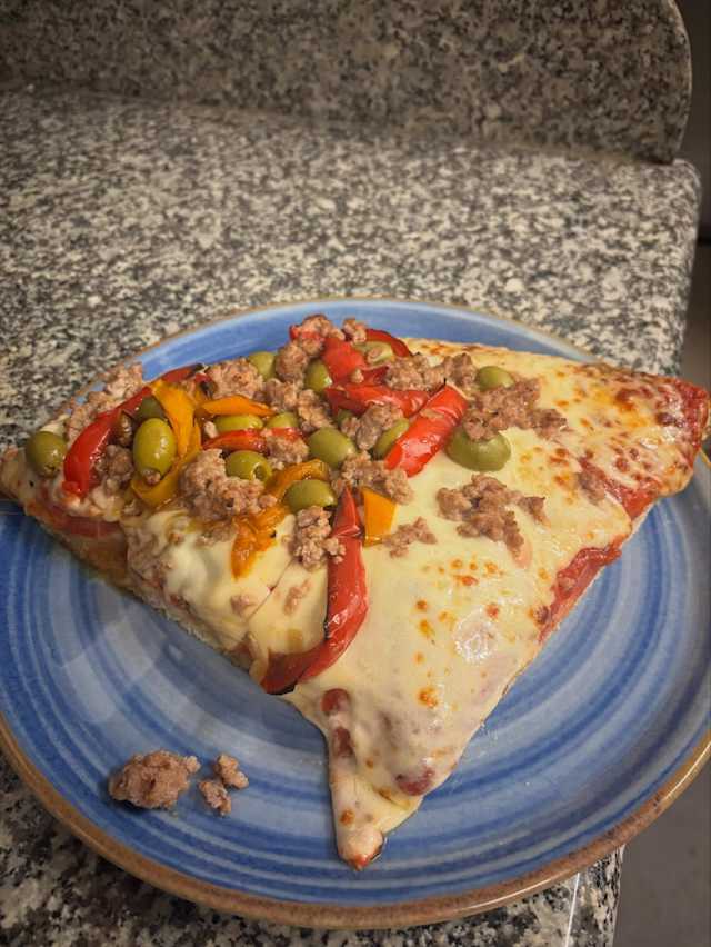- Pomodoro, mozzarella, salsiccia nostrana, peperoni arrostiti, olive