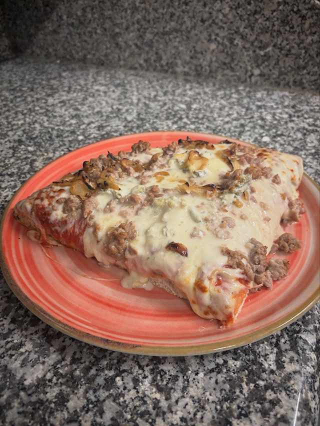 - Pomodoro, mozzarella, zola, cipolla caramellata e salsiccia