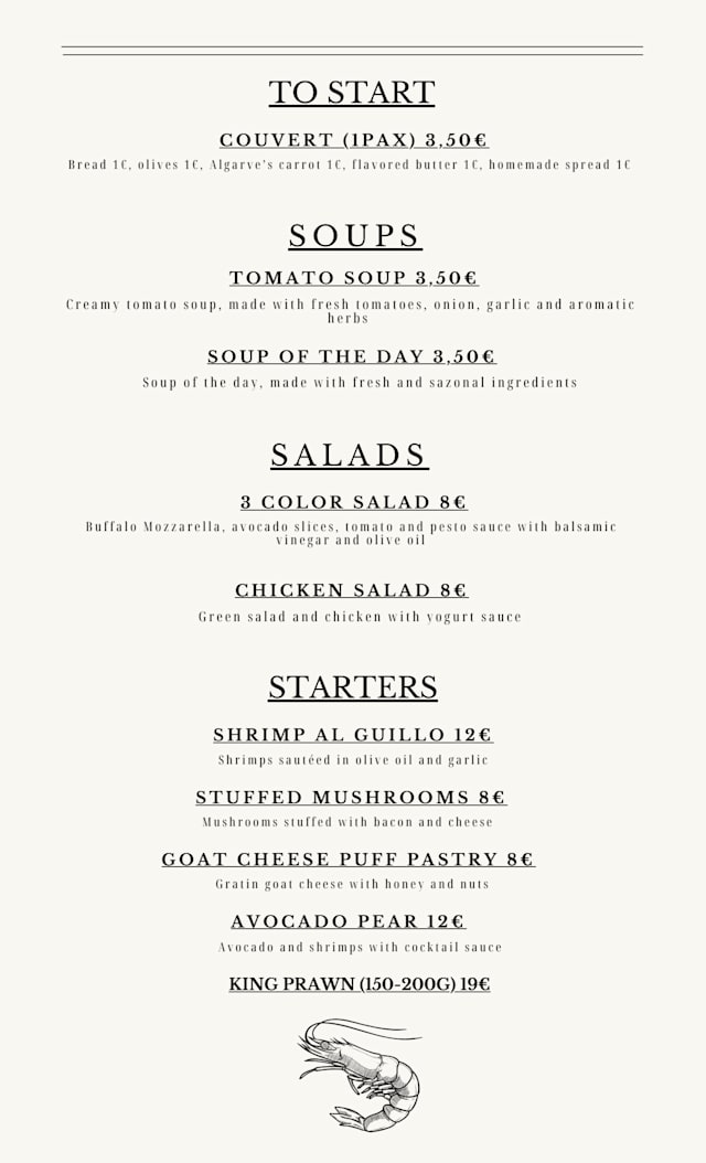 10/10An outstanding evening. The food and ambience is perfect in this restaurant. A variety of dishes, the menu is fantastic - I would personally recommend the seabass as a main dish and prawns to start. The service is impeccable, super fast and efficient. One of the top, local restaurants in Quarteira-Vilamoura.