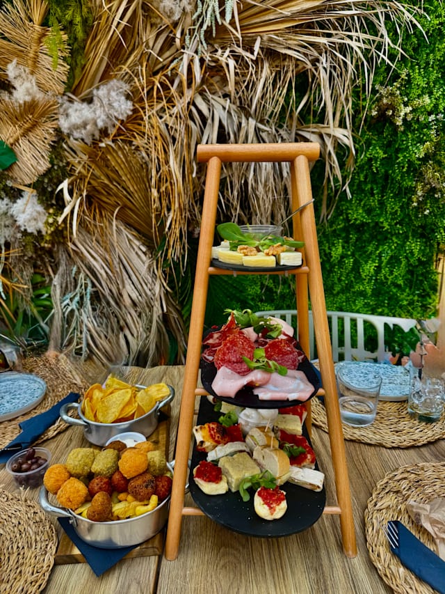 Aperitivo per 4 persone ( tagliere composto da capocollo di Martina franca, salame gentile, Mortazza, provola, burratina, polpette, crocchette di patate, verdure pastellate, focaccia rustica, trancio di pizza, mix di caciotte, mozzarelline, tramezzini e friselline, olive taggiasche, servito con pane carasau e pane caldo con delle confetture e salsa spoiler)