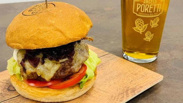 Hamburger di manzo da 200g, lattuga, pomodoro, provola affumicata, crudo croccante, senape al miele