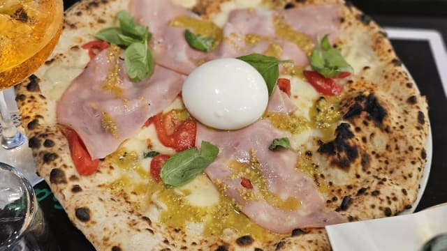Pomodoro, mozzarella, ricotta, prosciutto, basilico, parmigiano e pepe nero