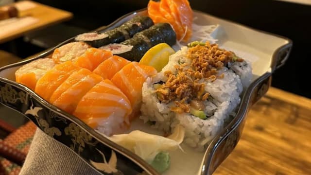 2 tempuras, 6 sashimi saumon, 2 sushi saumon, 8 california saumon avocat, salade de calamar