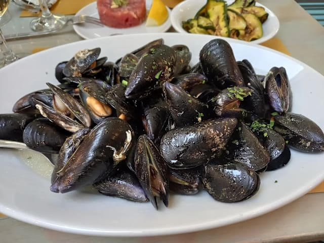 Sarde a beccafico, alici alla mediterranea, gambero a vapore con insalata, insalata di polpo e patate, caponata di tonno,moscardini al sugo, parmigiana di pesce