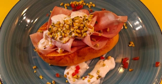 Hamburger di manzo 170g, crema di zucca, caciocavallo, pecorino, pancetta, cipolla fresca