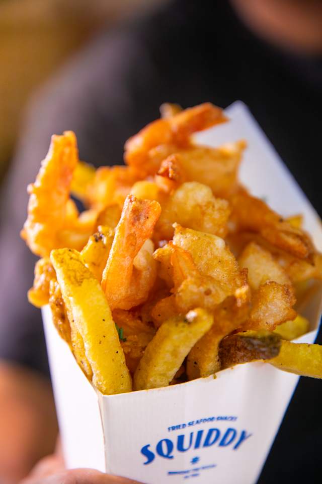 - Camarones fritoscon glaseado gochujang, cheddar, mayonesa de kimchi, lechuga y trocitos de tocino