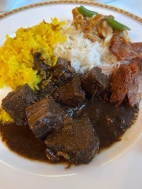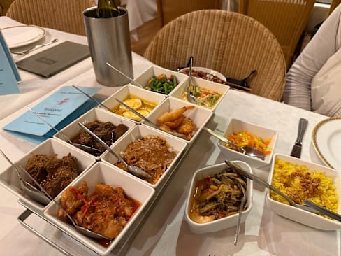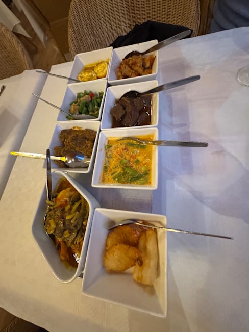 10/10Delicious beef dish (house speciality) and my niece enjoyed the duck, as did I when I tried some of hers. Attentive service and an intimate, atmospheric restaurant. It was nice to be able to buy wine as a half litre and the house white was a good accompaniment to the excellent food. Other diners seemed to appreciate the rijstafel.