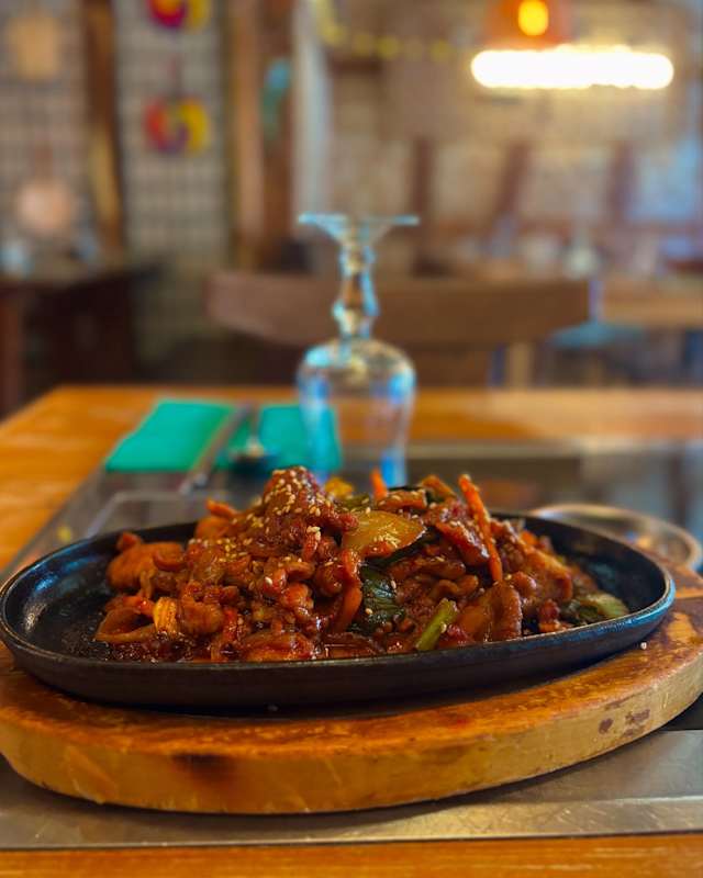 - Poulet sauté épicé et légumes grillés. Accompagnés de riz, soupe, sauce coréenne et d'un assortiment de crudités coréennes