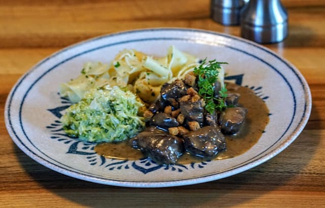 - Rindsfiletwürfel "Ojo de Agua" mit Kräuter-Sauce begleitet von neuen Kartoffeln und Ofen-Peperoni