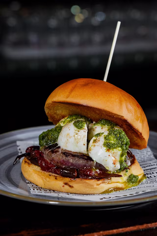 - Hamburger 220g, melenzane a funghetto, ciliegine di bufala e pesto di basilico