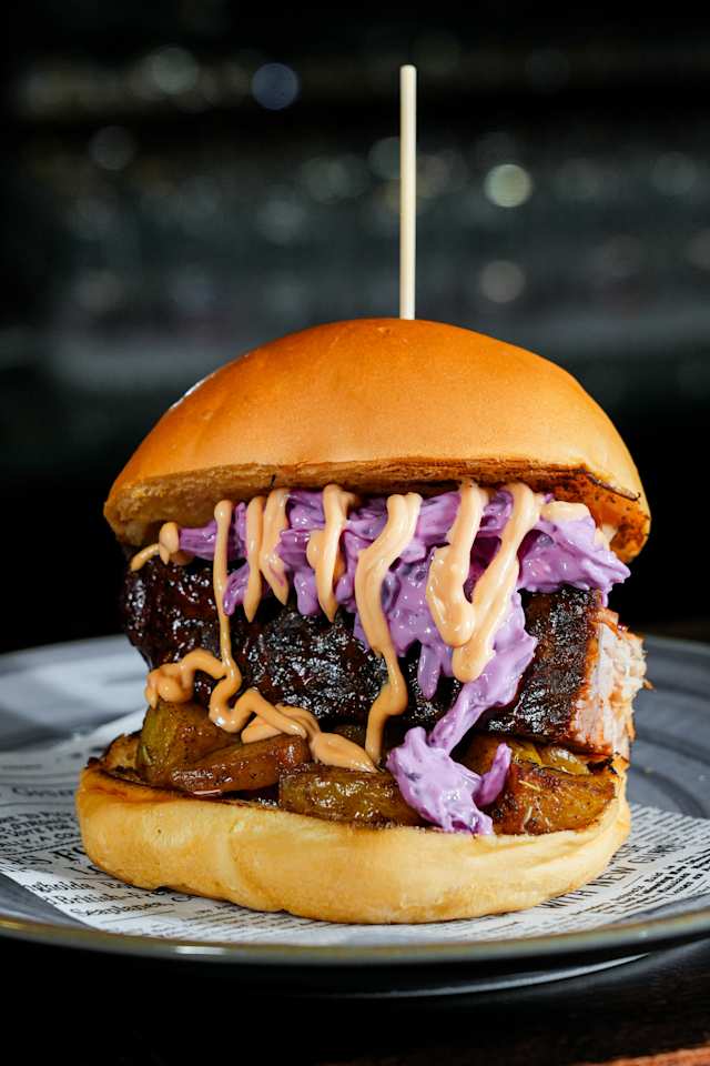 - Doppio hamburger smash da 100 grammi, cheddar, bacon, cetriolini, salsa burger, BBQ