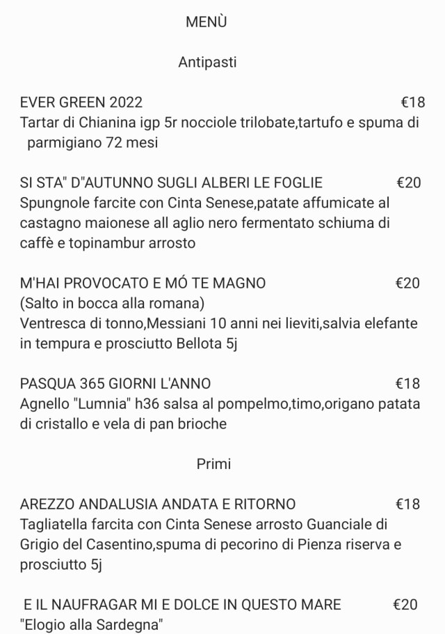 10/10The restaurant is within walking distance of Arezzo and is run by a young couple who develop and serve wondrous new recipes. The delicious, innovative food is well matched by their enthusiasm and friendliness. This provides a special dining. experience.