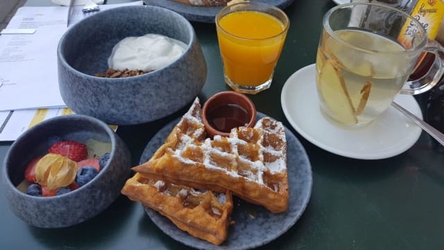 One Waffle & Syrup Extra toppings: candied nuts, seasonal fruit, and chocolate (+1,00 each