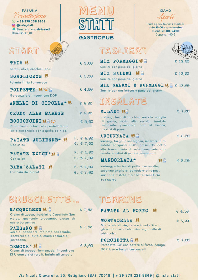 Situato nel centro di Rutigliano, lo Statt è il vostro amichevole locale di quartiere, accogliente, caldo, ma sopratutto ricco di cose che vi faranno viaggiare con tra i nostri piatti tipici pugliesi, ma anche nazionali in chiave gastropub.