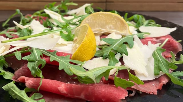 Carne salada cruda tipica della zona del garda servita con rucola e scaglie di grana
