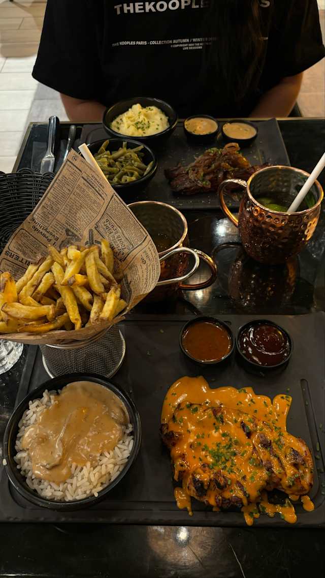 - Mexican burger + frites : mexican burger + frites poulet mariné 150g, avocat, salade, tomates, oignons, cornichons, cheddar