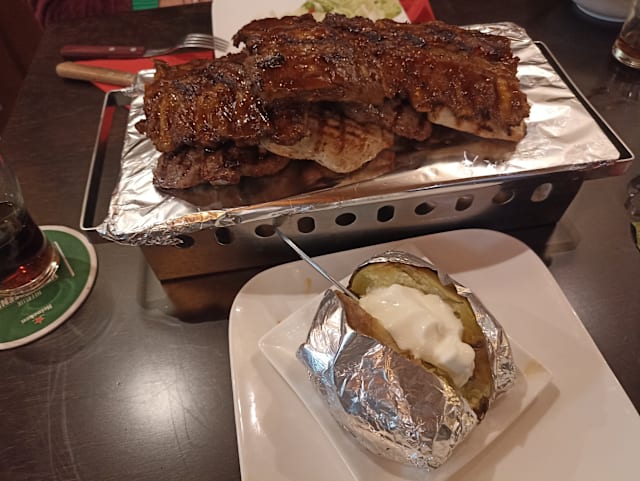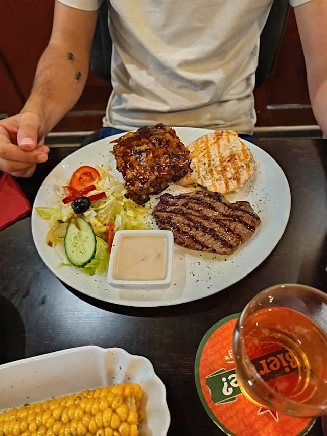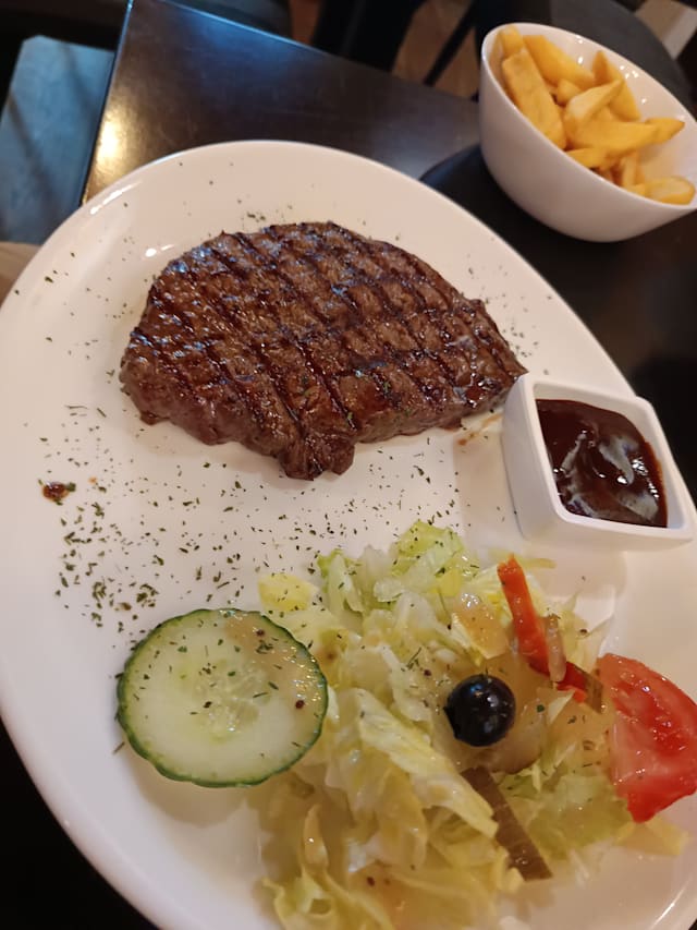 4.5/10I went on a date there with my girlfriend, her well-done steak was more rare than my medium-rare steak, after politely asking a waiter if they could cook her’s more he took our plate and came back 2 minutes later with the same steak still just as rare, instead of 1 fries and 1 potatoes we got 2 fries, instead of 2 sauces we got 1 but was still charged for 2, had to hunt down the waiters because they never came to our table even though the place was not very busy. I will not be coming back. 100€ for 3 beers, 2 steaks, 2 sauces, are not acceptable with this quality and service.