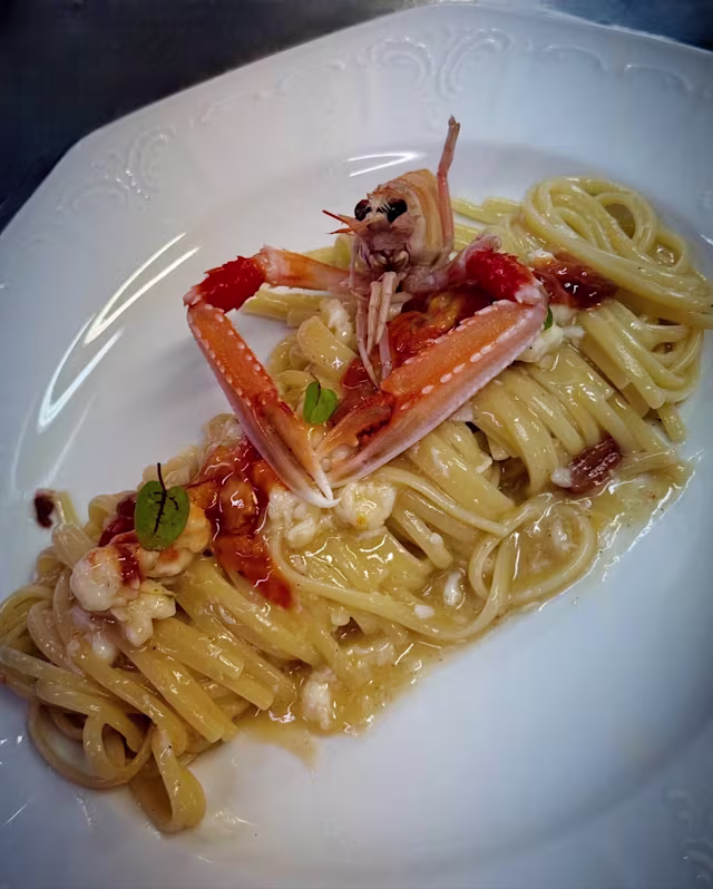 - Bisque di gamberi viola, caramello ai crostacei, tartare di gamberi viola e scampi di gallipoli
