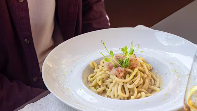 - Pici del senese mantecati al pesto di cavolo nero tardivo con chips di guanciale croccante della norcineria scarpaccia
