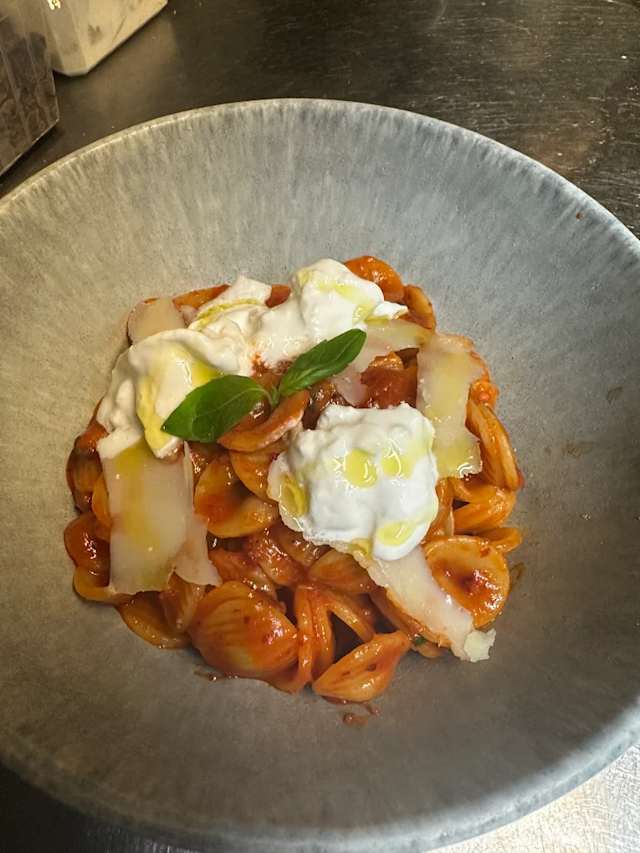 - Casarecce, sauce tomate, aubergines frites, basilic et stracciatella