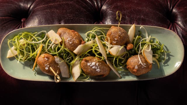 Polpette di carne mista tipiche milanesi servite con spinacino in agrodolce, cipolla pickles, maionese allo zafferano e maionese al dragoncello
